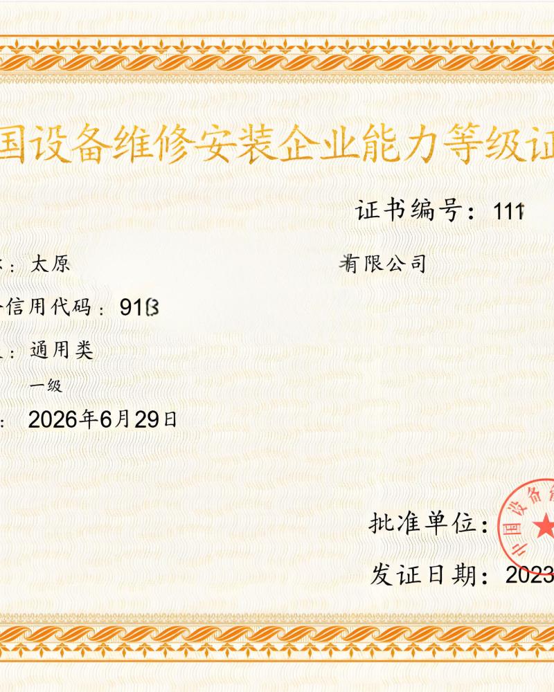设备维修安装企业能力等级证书