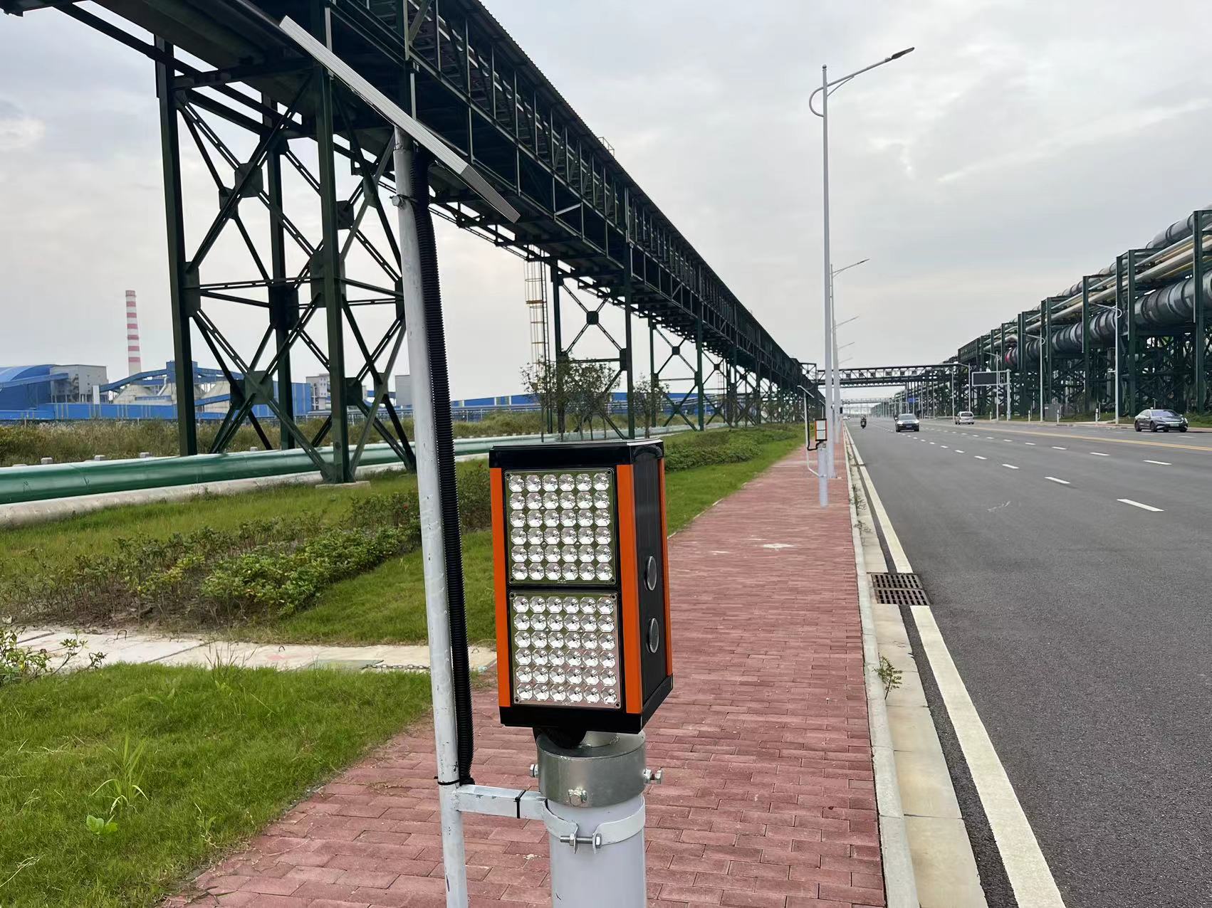 同步黄闪灯通过多盏灯之间的协调闪烁,形成连贯的视觉提示,引导驾驶员保持正确行驶方向。